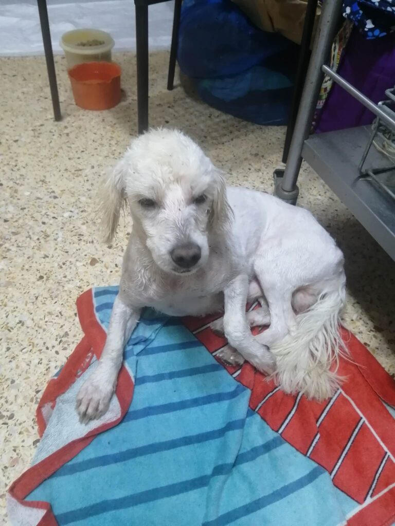 Το σκυλάκι περιφέρονταν στην Αμάρυνθο σε πολύ άσχημη κατάσταση, ήταν μέσα στα τσιμπούρια , το μάζεψε μέλος μας και τό μετέφερε στο κτηνιατρείο, όπου το κουρεψαμε και το αποπαρασιτωσαμε.